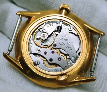 Mentions sur le mécanisme: N° de série (92015) sur un pont, 23 камней 2209 et logo Raketa sur le pont.