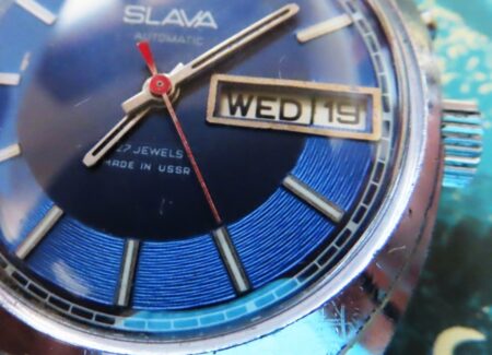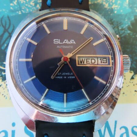 Mécanisme : Mécanisme : Slava S2427 à 27 rubis, automatique, avec double tantième.