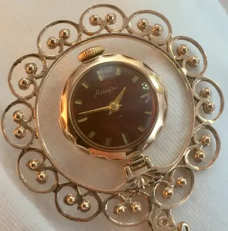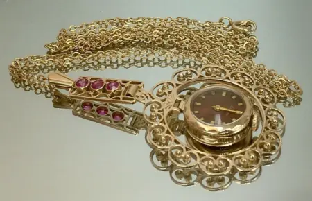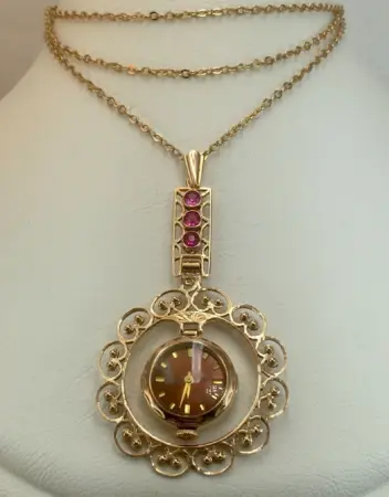 Montre pendentif pour dame en or massif sertie de rubis (rubis synthétiques soviétiques: voir ici) de la Fabrique Horlogère d’Erevan