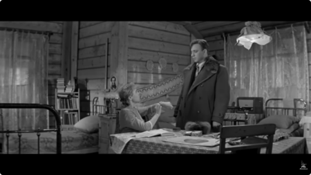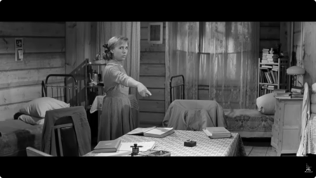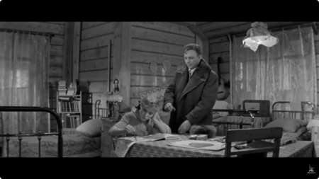 Tout finira par s’arranger lors d’une scène où tout le camp participe à la construction d’une maison pour un jeune couple marié, Tosya et Ilya se retrouvent dans un grenier, chacun avec une boîte de clous. Ce moment anodin les rapproche et, blottis l’un contre l’autre sur une bûche, ils s’échangent leur premier baiser.