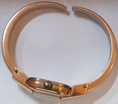 La montre en question est une montre-bracelet de dame, mécanique, sans trotteuse, avec un bracelet articulé « crabe » en aluminium doré, produit par la 2e Fabrique de Montres de Moscou