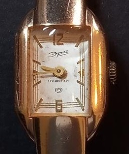 Elle est de marque : Эра (Era, ère), de type « Terechkova », du modèle 388ЧН/ЧН-452K « браслет » (bracelet) avec un boîtier d’aluminium doré (anodisé) (mais la couronne est plaqué or) à fond clipsé. Une montre qui a bien dû coûter un ou deux mois de salaires…