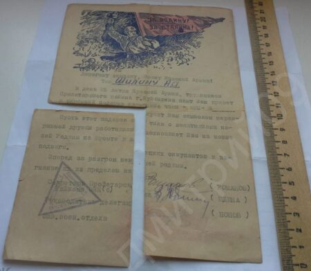 Il s’agit d’une lettre de soutien envoyée du front intérieur (la ville de Kouïbychev, qui servait alors de capitale administrative de réserve de l’URSS (en savoir plus sur Kouïbychev et son industrie de guerre) à un soldat engagé au front. Les usines et districts soviétiques organisaient alors des collectes pour envoyer des cadeaux symboliques aux soldats : montres, gants, chaussettes, couteaux, etc.