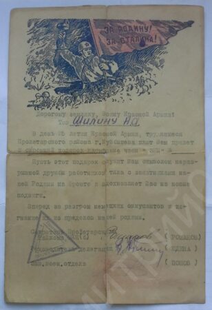 La montre mentionnée — montre de poche de l’usine ZIM (Завод имени Масленникова) — était un cadeau patriotique fréquent. Le document mentionne Шилин Н.А. (Shilin N.A.) et le qualifie de « земляк » — compatriote / du même village ou région. Ce soldat venait peut être du district Prolétarsky ou des environs de Kouïbychev. Ce type de lettre était envoyé soit directement au front, soit remis lors d’une permission.